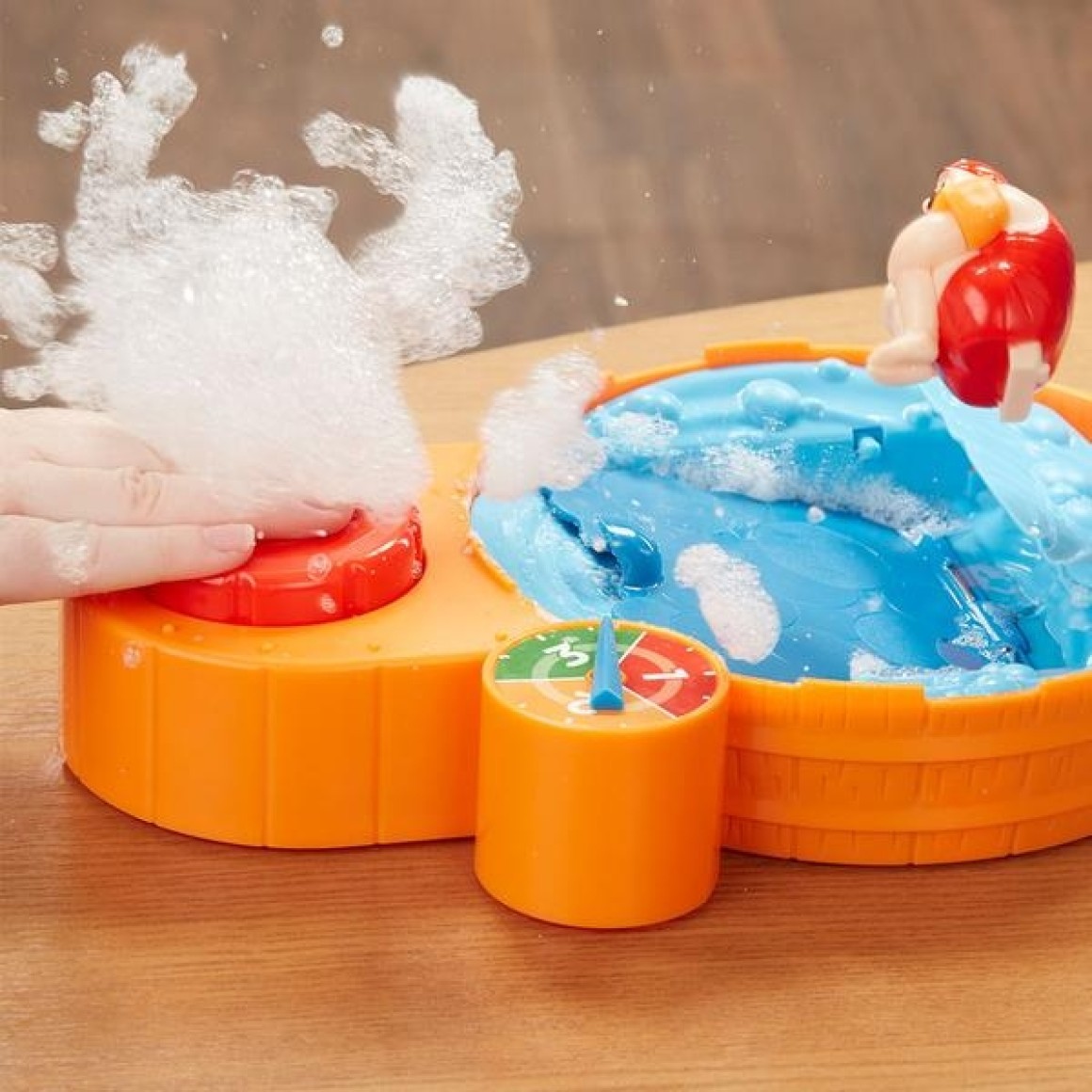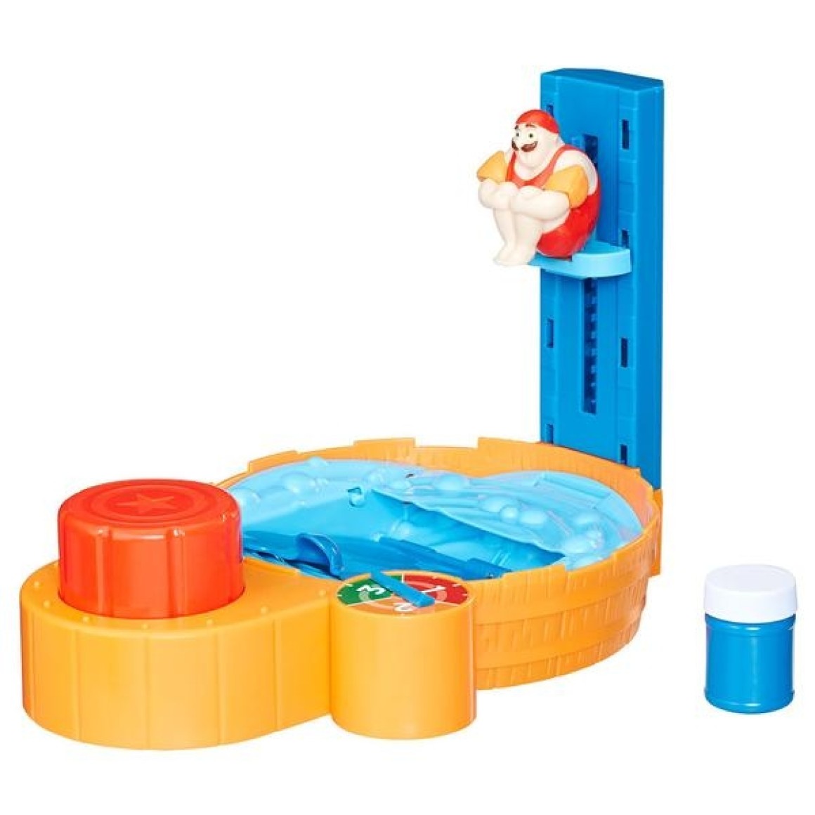 Cuidado com a espuma voadora! Despeje a solução de bolha de demonstração incluída na unidade de cuba, gire o girador e pressione o botão vermelho grande o número de vezes mostrado para enviar o mergulhador para cima ou para baixo da escada. Cada pressão do botão aumenta a quantidade de espuma na banheira. Uma vez que o mergulhador alcança o topo da escada, ele vai cair na banheira, lançando uma bola de espuma no jogador azarado. O único jogador a não fazer o mergulhador cair e a espuma voar ganha o jogo.