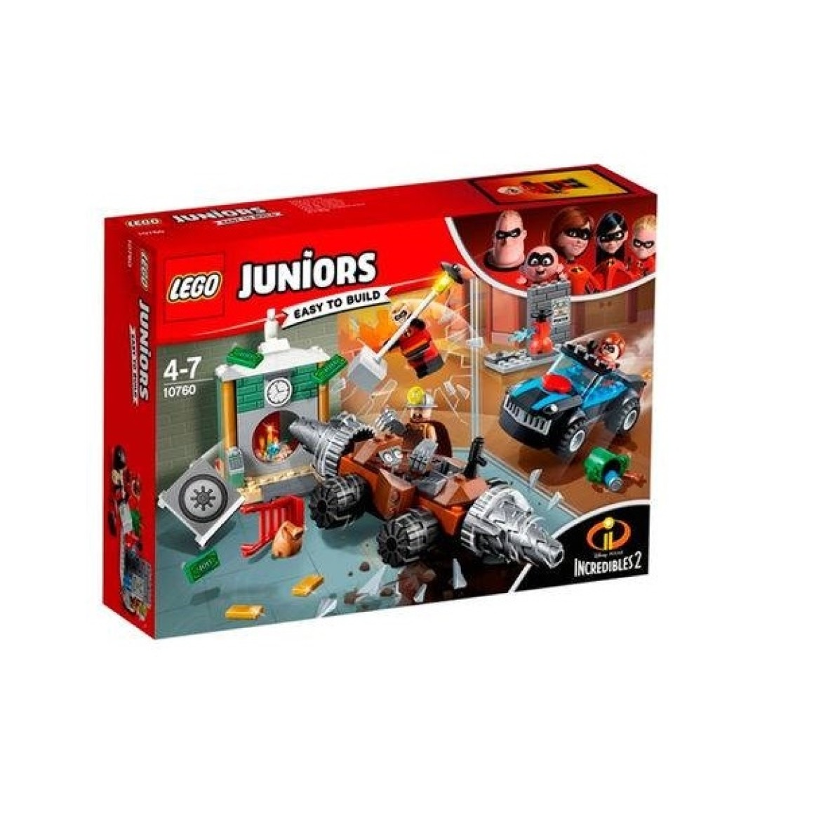 Acenda a imaginação de seu filho para alguns Lego® Juniors Os Incríveis 2, com este emocionante jogo Underminer Bank Heist, com cofre de banco com porta separável, veículo Incrível com chassi Quick Start, máquina Tunneler com chassi Quick Start e brocas giratórias, mais uma construção de rua com parede de tijolos, cartaz de procurado e poste edificável. Este brinquedo divertido para meninos e meninas também inclui um guia simples para construir e jogar, para ajudar a construir a confiança em crianças de 4 a 5 anos. Inclui 3 mini figuras.Apresenta um cofre de banco com porta separatista e uma cena de rua com parede de tijolos, cartaz de procurado e um poste de iluminação edificável.Também inclui 2 veículos: um chassi Incredibile com Quick Start e uma máquina Tunneler com chassi Quick Start e brocas giratórias. Os elementos acessórios incluem 2 notas de dinheiro, 2 elementos de barra de ouro, elemento de diamante, pepita de ouro, saco de saque, lixeira, lata de refrigerante, vara e um carrinho de mão.