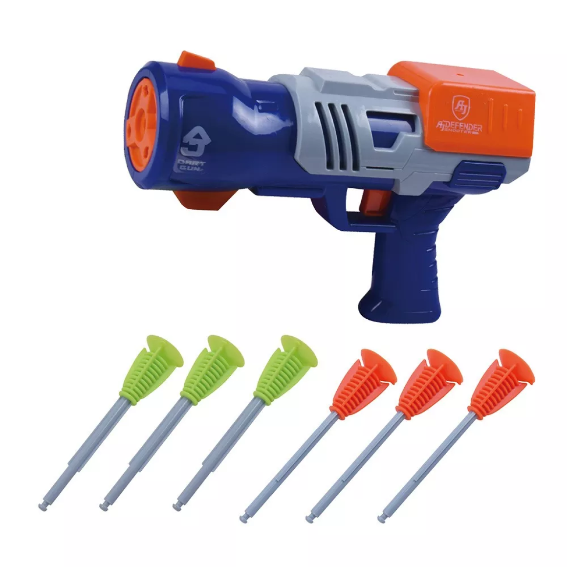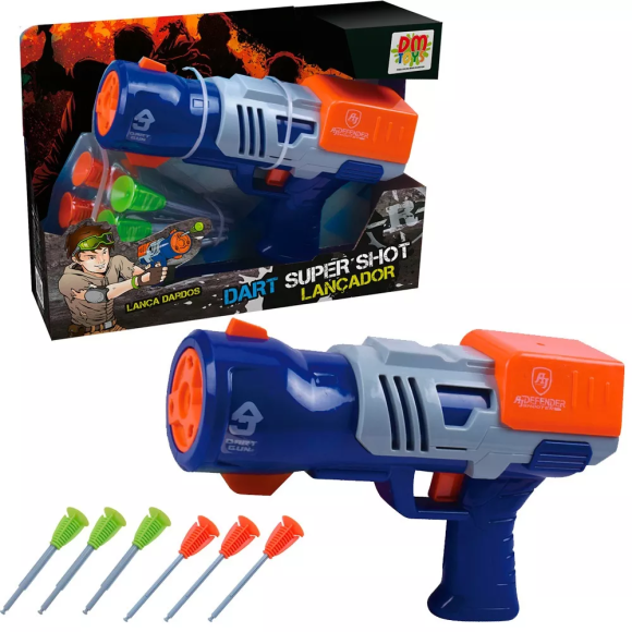 Lançador que carrega 3 dardos por vez dando mais rapidez aos disparos. No verso da embalagem vem um alvo desenhado, que pode ser destacado e usado na brincadeira.