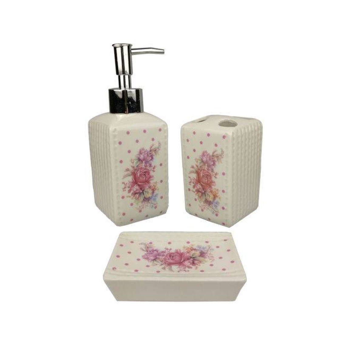 O kit banheiro é composto por três peças com lindos formatos e estampas, todos em porcelana de ótima qualidade, tudo isso com estilo vintage com excelente acabamento e tamanho.