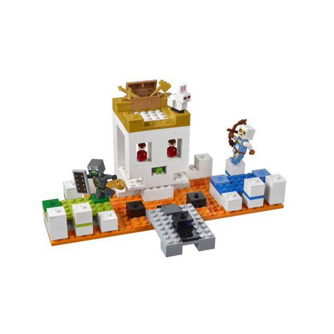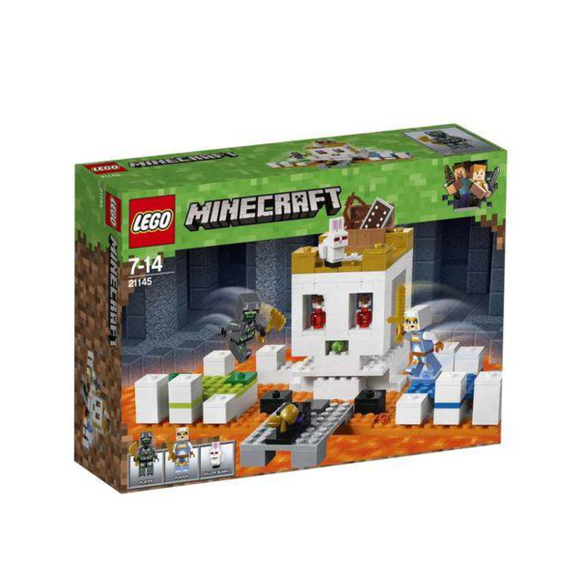 Evite o atirador de lodo e derrote seu oponente para reivindicar o prêmio de maçã de ouro, e lute contra o coelho assassino para obter as poções de cura e um baú contendo um escudo e arco! Inclui 2 mini figura, cada um com sua própria capa exclusiva de Minecraft, além de uma figura de coelho assassino. Apresenta um cenário Lego Minecraft Skull Arena construível com uma estrutura grande em forma de caveira, lava, pódios de jogadores verdes e azuis, plataforma com maçã dourada e um atirador de míssil que dispara um elemento de míssil lodo.