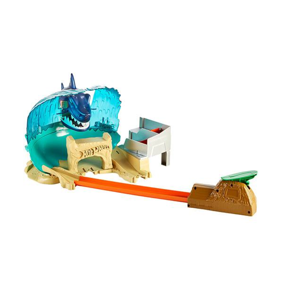 Um enorme conjunto com o tema de praia, com o grande tubarão que mastiga carros. A imaginação dos meninos não encontra limites com este desafio para salvar a cidade. Derrote o tubarão lançando um carro diretamente em suas mandíbulas. Fácil de arrumar, sem peças soltas, e com uma performance incrível! Construa uma cidade conectando outros conjuntos de Hot Wheels City. Os novos conjuntos também são compatíveis com outros conjuntos de pistas, como as de cor laranja.