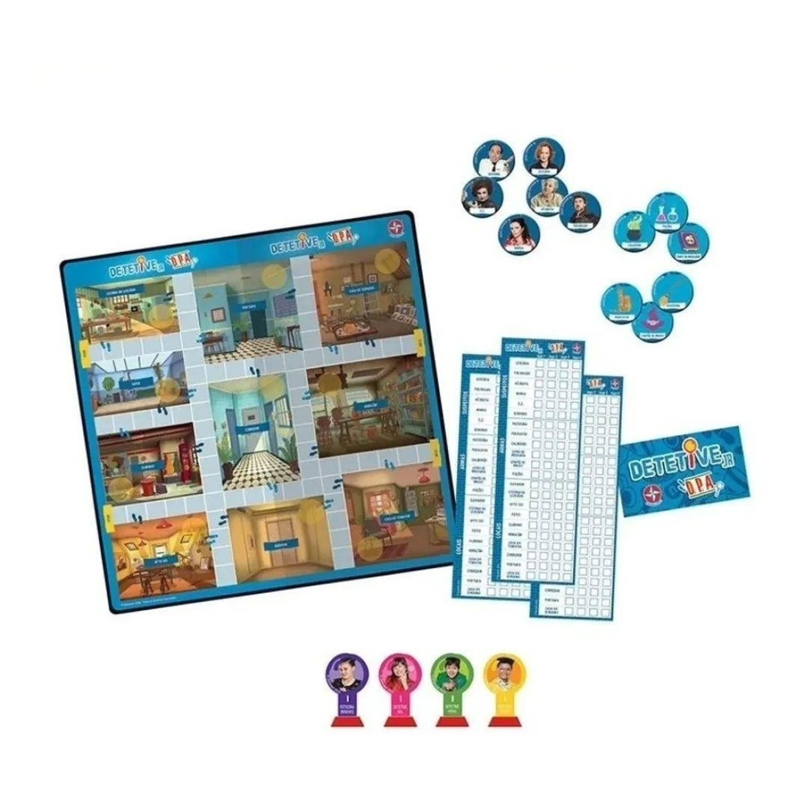 Há 77 anos a Estrela participa das brincadeiras das crianças desenvolvendo jogos que ajudam no desenvolvimento da lógica e raciocínio dos pequenos. No Jogo Detetive Jr. você e seus amigos vão tentar descobrir quem roubou as capas dos detetives. Descubra nesse intrigante jogo de mistério e ajude os personagens de Detetives do Prédio Azul a solucionarem o caso! O jogo vem com 1 tabuleiro, 13 cartas suspeitos, 4 cartas caldeirão, 4 peões, 5 peões cartonados, 5 bases plásticas, 1 envelope confidencial, 1 cartela adesiva, 1 dado, 1 bloco de anotações e 13 fichas redondas. Com Estrela a diversão não para! Dados TÉCNICOS Ref.: 1201602900103 Idade Recomendada: + 5 Anos Dimensões aproximadas da embalagem: 45 x 25 x 5 Cm Código de Barras: 7896027548525 Garantia: Contra Defeitos de Fabricação Todas as informações divulgadas são de responsabilidade do fabricante/fornecedor. Imagens Meramente Ilustrativas. Observe atentamente a idade recomendada para o brinquedo.