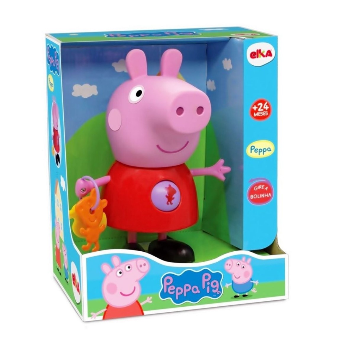 Boneco com 24 cm de altura, bolinha que gira na barriguinha, e os brinquedos preferidos dela na mãozinha.