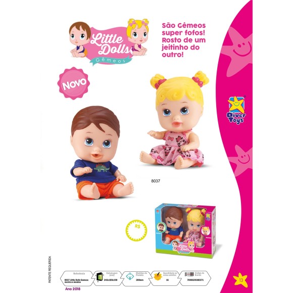 A coleção Little Dolls da Divertoys é um encanto e um super sucesso!! Bonequinhas muito fofas e graciosas, todas em vinil macio e perfumado. Possuem características únicas e diferenciadas! Agora com um super lançamento, Little Dolls Gêmeos, são dois irmãozinhos super fofinhos, uma menininha super estilosa e um menininho, o primeiro de toda a coleção Little Dolls! Essa coleção da Divertoys está de arrasar, são vários modelos da linha Little Dolls. Colecione! Tamanho aproximado dos bonecos: 17,5cm de altura e 8cm de largura. Boneca em vinil macio e perfumado.