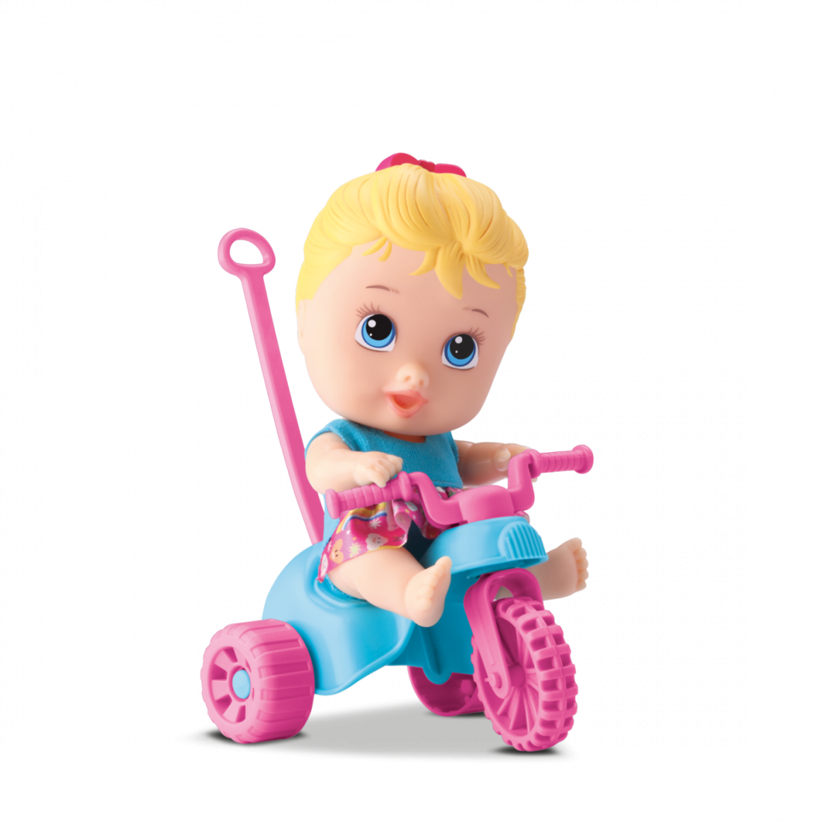 Boneco Little Dolls Playground c/ Triciclo Menina - Divertoys Um lindo triciclo, com roda livre, ou seja, a criança pode brincar de empurrar o triciclo de verdade. Boneca todo em vinil.