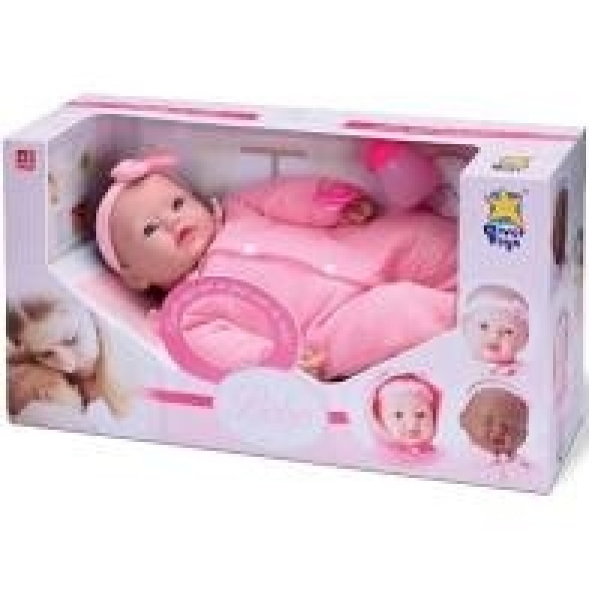 Contém: 01 Boneca Bebê com modulo de som, mamadeira e chupeta