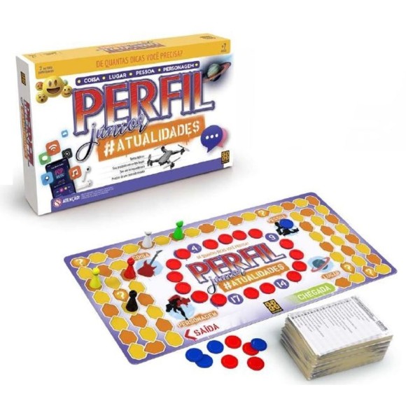 Com o Jogo - Perfil Júnior - Atualidades - Grow a diversão é garantida! Junte os meninos e as meninas para encarar o Perfil Junior Atualidades. São 20 dicas para os jogadores adivinharem qual é o Perfil da rodada. A brincadeira ficou ainda melhor pois, agora, as perguntas possuem um conteúdo mais direcionado para o cotidiano das crianças. Peça dicas para tentar descobrir qual é a resposta certa da carta da rodada. Neste jogo divertido e emocionante ganha quem chegar primeiro ao final do tabuleiro, andando ao acertar as cartas das rodadas! Recomendado para crianças a partir de 7 anos de idade, além de super divertido, Perfil Júnior - Atualidades é um jogo que vai ajudar a criançada a desenvolver as habilidades de raciocínio lógico e o conhecimento sobre atualidades. O Jogo Perfil Júnior - Atualidades da Grow acompanha 01 Tabuleiro, 01 Baralho com Dicas, 06 Peões, 20 Fichas Vermelhas, 05 Fichas Azuis e 01 Folheto de Regra, e pode ser jogado por 2 a 6 jogadores.