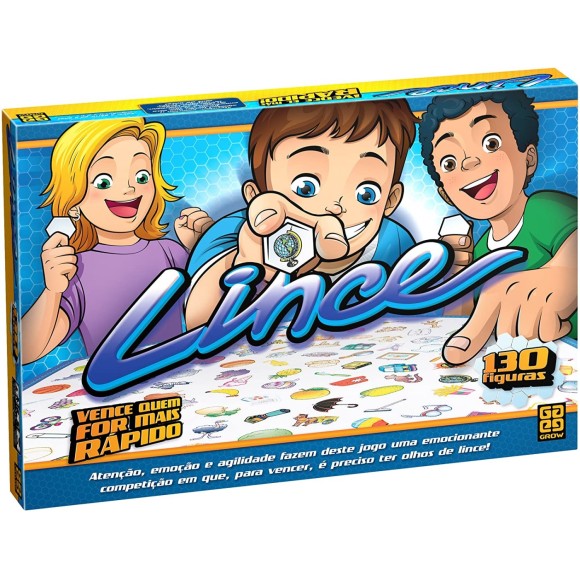 Lince é uma movimentada competição na qual sua rapidez e seu reflexo decidem cada jogada. Todos os jogadores recebem as cartelas com figuras que estão no tabuleiro. Depois do sinal, devem tentar localizá-las rapidamente, com suas fichas coloridas. Quem colocar primeiro as fichas será o vencedor. Por isso, não perca tempo! Você pode vencer ou perder em questão de segundos! Agora, respire fundo, abra bem os olhos e mostre que você é fera neste desafio!Fabricante - GrowItens inclusos - 1 tabuleiro - 1 saco plástico - 18 fichas - 130 cartelas ilustradas e 1 manual de instruçõesCódigo do fabricante - 00432Número de Jogadores para - 2 a 6 jogadoresTempo de jogo aproximadamente - 10 minutosGarantia - 3 meses prazo de validade - indeterminadoPaís de origem - BrasilIdade recomendada - recomendado maiores de 5 anos de idadeSelo de segurança do Inmetro - CE-BRI/ICEPEX-N 01264-25 003737/2019 - Ocp 0046Aviso - as cores podem variar entre as imagens mostradas acima e o produto