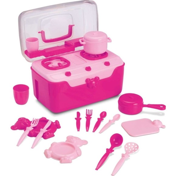 Maleta em plástico resistente com alça e tampa, contendo utensílios domésticos em plástico, em cores variadas e atraentes. O fogão possui uma chapa removível e a tampa é acrílica, imitando um fogão de verdade. Na maleta ficam guardados os utensílios domésticos e após a retirada deles, a chapa retorna ao fogão para dar início a brincadeira. O produto promove a socialização, o diálogo e a interação entre as crianças que vivenciam através desse produto o mundo adulto do cozinhar e se alimentar.