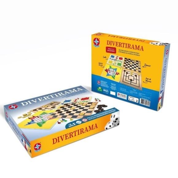 Jogo Divertirama - Estrela Um jogo com 4 tabuleiros que possibilita jogar 5 jogos diferentes: Ludo e Ludo Real, Jogo do Moinho, Xadrez Chinês e Jogo de Damas. Diversão para a família inteira. Idade recomendada: a partir de 6 anos de idade. Selo INMETRO: 001809/2020 / INGOS: 000915/2019.