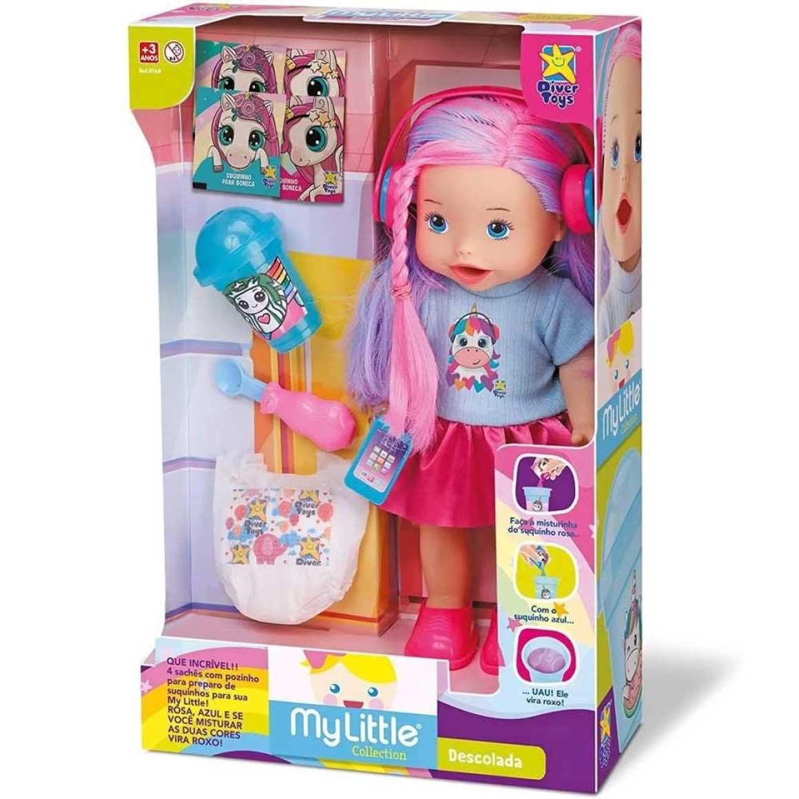 Descolada linda boneca com cabelo colorido toda descolada, vem com fone de ouvido, celular, tênis e um vestido super lindo de unicórnio, copo decorado de unicornio e 4 sachês com pozinho colorido.
