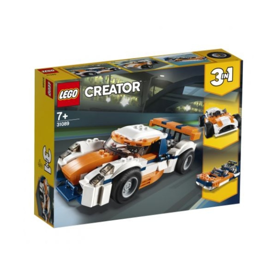 Dê voltas ao circuito de corrida com o Carro de Corrida Sunset; apresenta um esquema de cores branco e azul escuro, carroçaria aerodinâmica com enormes entradas de ar, para-brisa redondo e colorido, faróis coloridos, motor visível instalado na traseira, grande aerofólio traseiro e pneumáticos de grande aderência ao solo. Venha descobrir o seu design de eixo cruzado e baixa fricção e levante o teto para aceder ao cockpit. Depois ocupe a sua posição na linha de partida e prepare-se para a corrida! Quando tiver terminado, reconstrua este modelo 3-em-1 LEGO® Creator para criar um Carro de Corrida Clássico conversível ou vá para as ondas a bordo do potente Barco de Corrida.