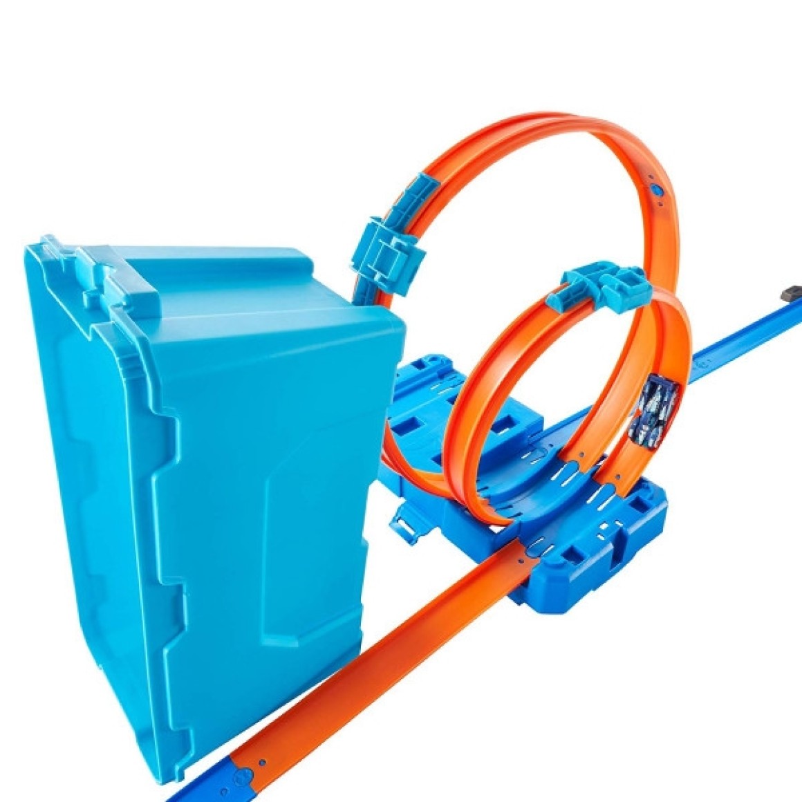Caixa de pistas com peças que oferecem opções infinitas para manobras radicais. A radical ação de loop é ainda mais irada ao conectar a pista na tampa, em 8 lugares. A parte inferior possui dois baldes acoplados, além de um local para conectar pistas, conjuntos adicionais ou mesmo componentes, de modo a criar ações com ainda mais adrenalina Os componentes são embalados no cesto, facilitando o transporte. A caixa também faz parte da brincadeira, e possui múltiplos pontos de conexão. O conjunto inclui veículo Hot Wheels, pista laranja, lançadores e conectores. A caixa também inclui mais de 16 peças para personalizar ainda mais sua pista!