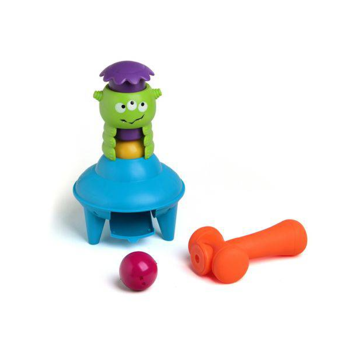 O Alien só quer comer bolinhas! Liberte as bolinhas martelando sua cabeça! Coloque as bolinhas no Alien, martele e libere-as pela nave, a portinha abre e as bolinhas saem! Cores e formas que estimulam os sentidos da criança.
