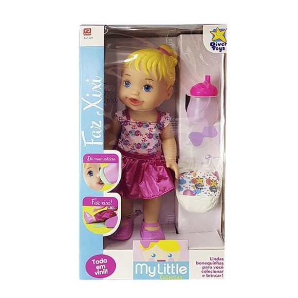 Essa linda bebezinha está pronta para brincar! A Boneca My Little Collection da Divertoys é um lindo bebê e faz xixi. Você irá adorar trocar, cuidar e alimentá-la como se ela fosse um bebê de verdade. Divirta-se com essa companheira que vem com mamadeira e fraldinha.