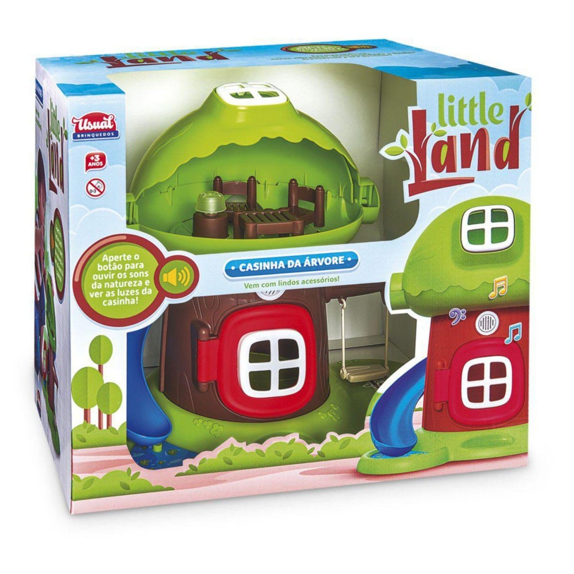 Brinquedo Infantil Casa Na Árvore E Parquinho Usual BrinquedosA Casa Na Árvore é acompanhada de diversos acessórios como balanço, escorregador e dispositivos de som e luz.Ao acionar o dispositivo que fica posicionado bem acima da portinha, acende a luz na parte superior, outra na parte inferior e também emite um som de um pássaro. Outros acessórios que acompanham essa linda casinha na àrvore são 2 cadeiras, 1 mesa e 1 caminha.Na parte inferior da casinha temos a portinha que abre e fecha e na parte superior temos a janela. Detalhes do ProdutoConteúdo Embalagem: 01 Casinha da Árvore,02 cadeiras, 01 mesa e 01 caminha.Com dispositivos de Som e de LuzIdade recomendada: A partir de 3 anos.Características:Dimensões da Embalagem (C x L x A): 37 x 27 x 33 cm.Referência do Modelo: 462.Marca: Usual Brinquedos.Certificação do INMETRO: 001527/2019 - OCP 0006