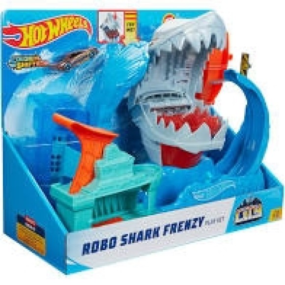 A Hot Wheels City está sob o ataque de um enorme tubarão robótico! Será que você é rápido o suficiente para atravessar a onda sem virar comida de tubarão nessa emocionante PIsta Hot Wheels? Comece sua jornada mergulhando o carro na câmara de água fria, depois levante a alavanca para carregar o carro no lançador e se preparar para correr pela onda. É sua única chance de acertar o Tubarão Robô! A boca da criatura se abre e, se o golpe falhar, você cai na barriga dele! Uh-oh, almoço de tubarão. Uma vez na barriga do gigante Tubarão Robô, o carro muda de cor magicamente! Mas você sempre pode se aventurar mais uma vez nessa incrível Pista Hot Wheels.